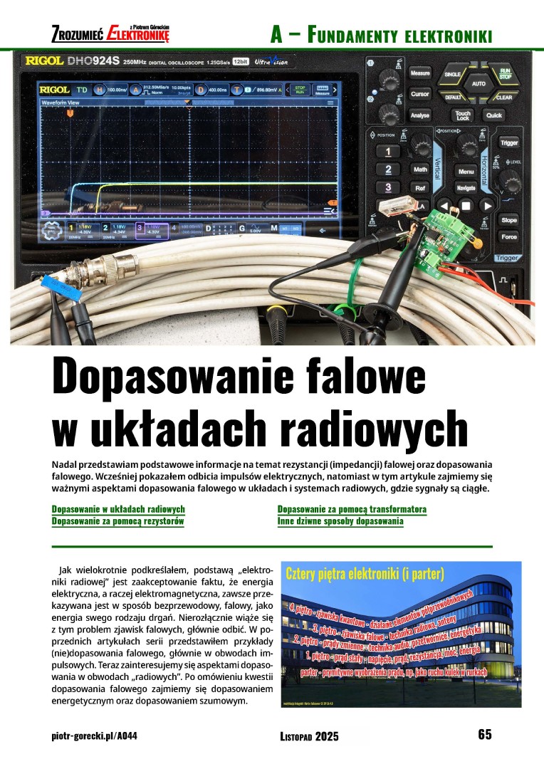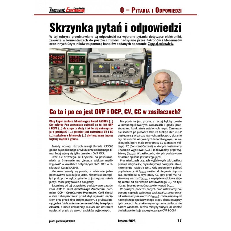 W tym numerze znajdziesz też szereg innych wartościowych artykułów z różnych dziedzin. Nie przegap ważnego materiału o dopasowaniu falowym w układach radiowych. W rubryce Pytania i odpowiedzi wstępnie omówiony jest temat funkcji OVP oraz OCP w zasilaczach. Omówiony jest wstępnie, bo zagadnienie okazuje się zaskakująco złożone i zostanie opisane szczegółowo w aż dwóch artykułach.