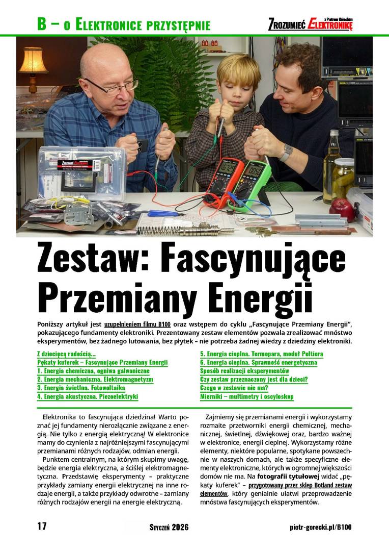 Dopiero teraz, po trzech latach przygotowań zaczynam obszerne kursy, cykle pokazujące elektronikę od podstaw, cykle ściśle związane z tytułem czasopisma. Właśnie w ofercie handlowej sklepu Botland pojawił się długo przygotowywany zestaw do eksperymentów, na moim kanale rozpoczyna się seria filmów pokazujących Fascynujące przemiany energii, a w tym numerze na okładkę „wskoczył” pierwszy artykuł tej serii.