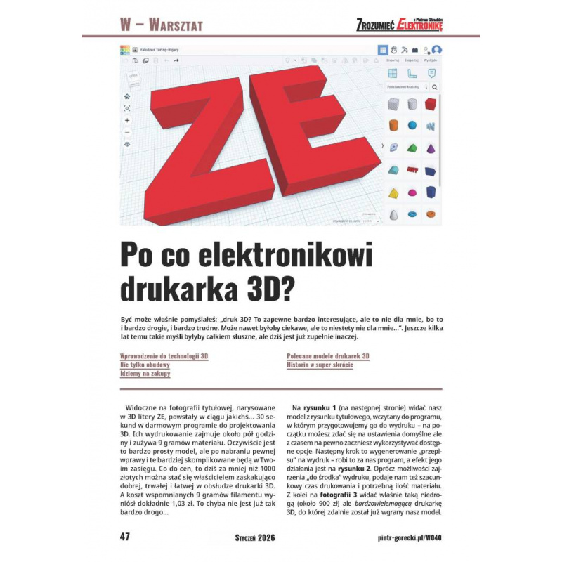 Zrozumieć Elektronikę to cyfrowy miesięcznik dla pasjonatów elektroniki, autorstwa Piotra Góreckiego. Artykuł okładkowy to pierwszy artykuł serii „Fascynujące przemiany energii”, czyli podstawy elektroniki dla niedoświadczonych i ciekawe eksperymenty i ćwiczenia dla bardziej zaawansowanych. W numerze znajduje się też wyjaśnienie „Po co elektronikowi drukarka 3D?”. A w skrzynce pytań jest odpowiedź na pytanie: Jaki kupić dobry niedrogi zasilacz dla elektronika? Ciekawy jest czwarty artykuł z serii „Jak działa smartfon?” oraz artykuł „Silniki krokowe - wstęp do budowy zabawek i mikromaszyn”. Wielu zainteresuje też materiał o wykorzystaniu analizator logicznego Saleae - bardzo pomocnego dla elektronika hobbysty przyrządu. Godny polecenia jest także pierwszy artykuł praktycznego kursu projektowania płytek drukowanych za pomocą darmowego pakietu projektowego KiCad. Numer zawiera też podsumowanie serii o małym liniowym zasilaczu do pracowni elektronika oraz wiele innych, interesujących materiałów. Numer ISSN czasopisma: 3071-7965.