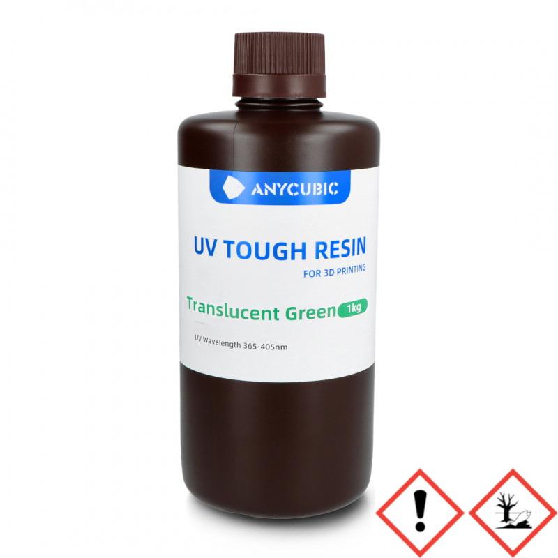 Przezroczysta zielona żywica firmy Anycubic wykorzystywana do formowania modeli w żywicznych drukarkach 3D. UV Tough Resin 2.0 charakteryzuje twardość a zarazem elastyczność, dzięki czemu powstałe modele są odporne na uszkodzenia wynikające z uderzeń, a także na wszelkie pęknięcia i odpryski, które mogą powstać podczas wyginania lub ściskania. Wydruki cechują się wysoką szczegółowością i precyzją. Długość fali UV, której zadaniem jest utwardzanie tworzywa, zawiera się w zakresie od 365 nm do 405 nm. W opakowaniu znajduje się 1 L żywicy.